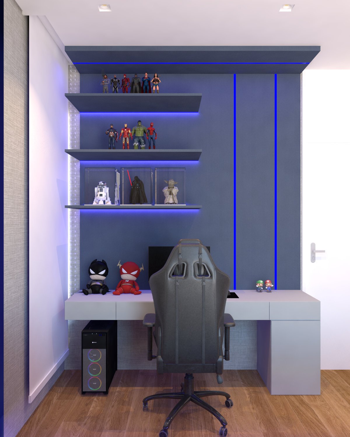 em LED, traz uma estética moderna e tecnológica, que remete ao universo dos games. Asprateleiras destacam a coleção de itens de cultura pop, que dão vida e personalidade ao