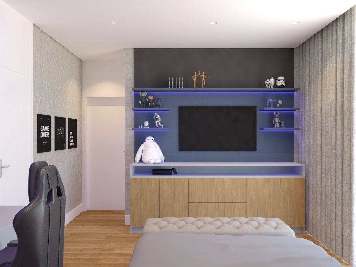 e setup gamer, além de uma área de TV para entretenimento. A cama traz uma atmosfera
